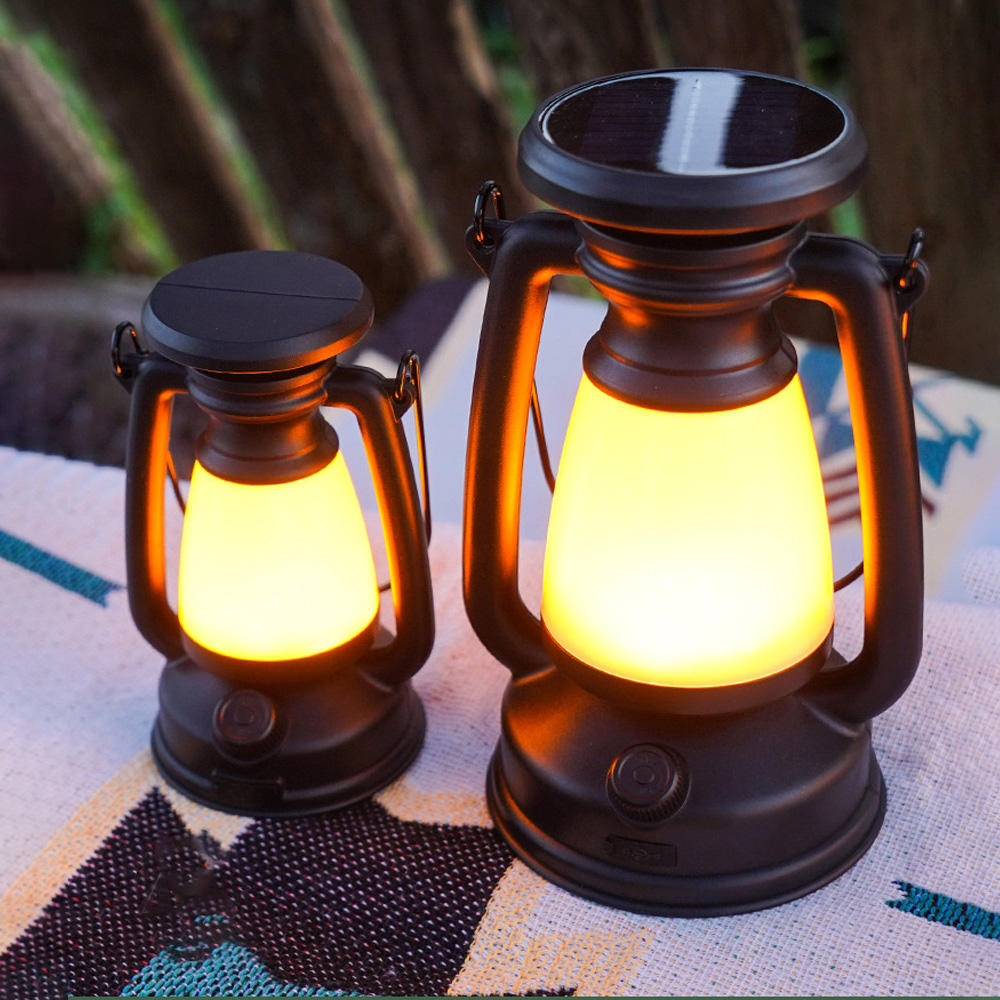 Solar-powered hanging LED lantern with warm light for outdoor garden, patio, and landscape decor. Waterproof and energy-efficient.
